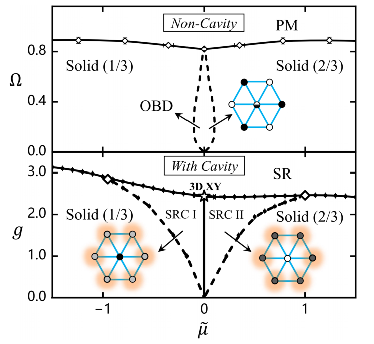 图2:与经典光场耦合(上图)和与量子光场耦合(下图)的阻挫里德堡原子阵列示意图与基态相图。
